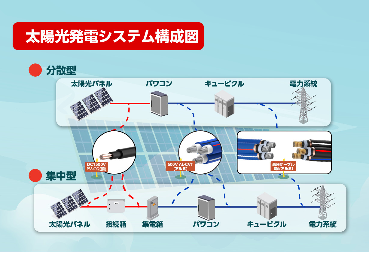 Kibor Cableは、システムの信頼性と経済性の両立を追求し、太陽光発電システム向けに多様なケーブルを製造しております。太陽光発電システムで広く採用されているDC/ACケーブルを提供しています。近年、銅価格の高騰を背景に、転売を目的とした銅線ケーブルの盗難事件が相次いでおり、特に太陽光発電所が標的になりやすい状況です。これは、発電所に銅線ケーブルが多用されていることに加え、郊外立地で人目につかず、基本的に無人であることが窃犯に狙われやすい要因となっています。こうした課題に対し、当社ではアルミ線(「AL-CVT」)を採用した盗難対策ソリューションを提供。さらに、50kW以上の大規模システム向けには、高圧ケーブル(銅/アルミ)も取り扱っており、発電効率の向上とコスト削減に貢献します。